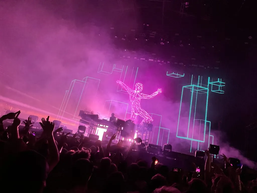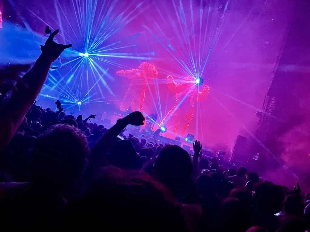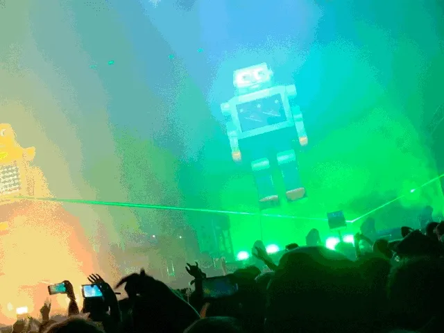 Lots of songs had animated visuals – repetitive visual “riff” loops, used much like a sample. Many of these were dancing characters or emotive “talking head” characters, mouthing those iconic samples. Other songs focused on lights and lasers, so you weren’t tempted to spend too long watching screens.