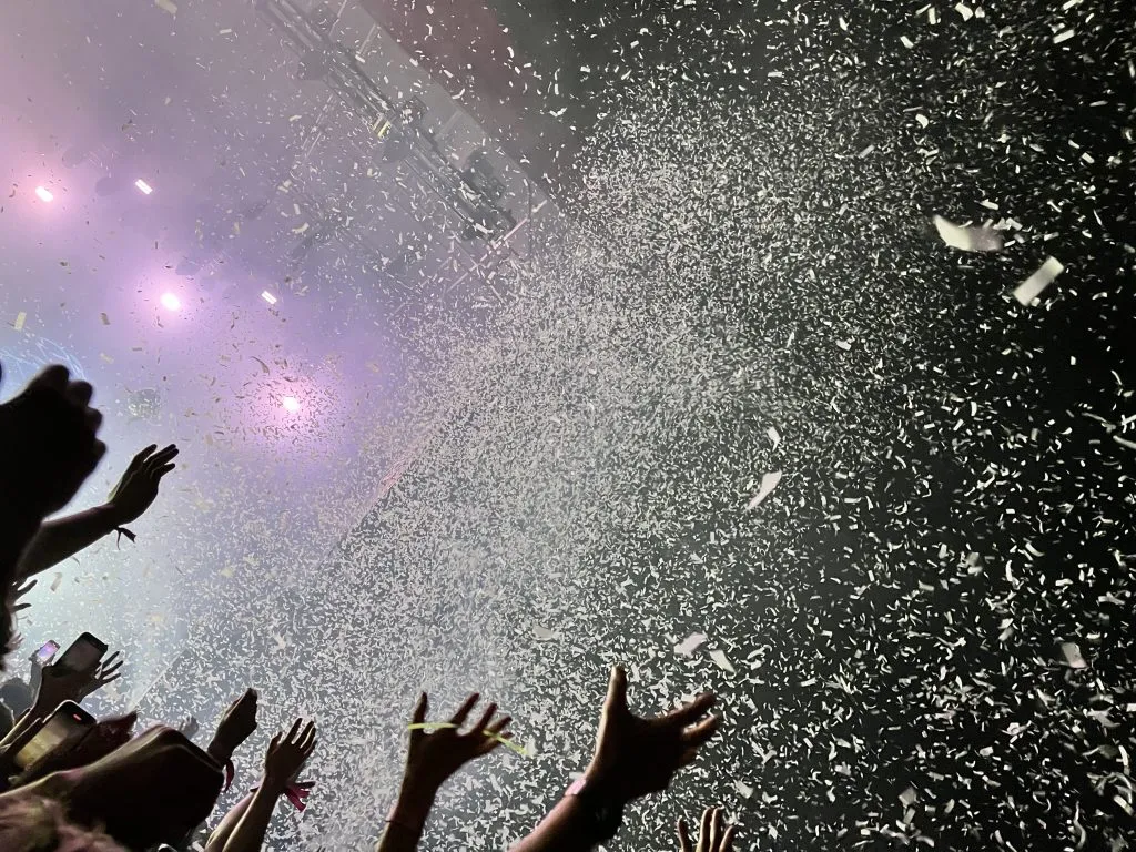 And also about 10-15 huge bouncing balls, chucked out into the crowd, then magically disppeared on cue somehow.